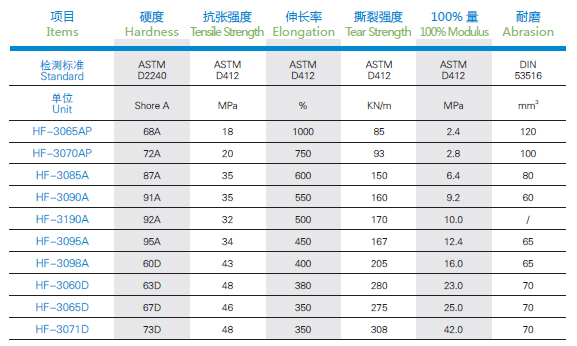 华峰30系列产品具有优异的物理性能、力学性能、耐磨性能和环保性能,高撕裂强度、快速成型及优异的耐寒和耐热性能等特点,主要应用于足球鞋大底、鞋材配件、密封件、运动护具、手机护套、机械零配件、共混改性、电梯轮和滑板轮等。